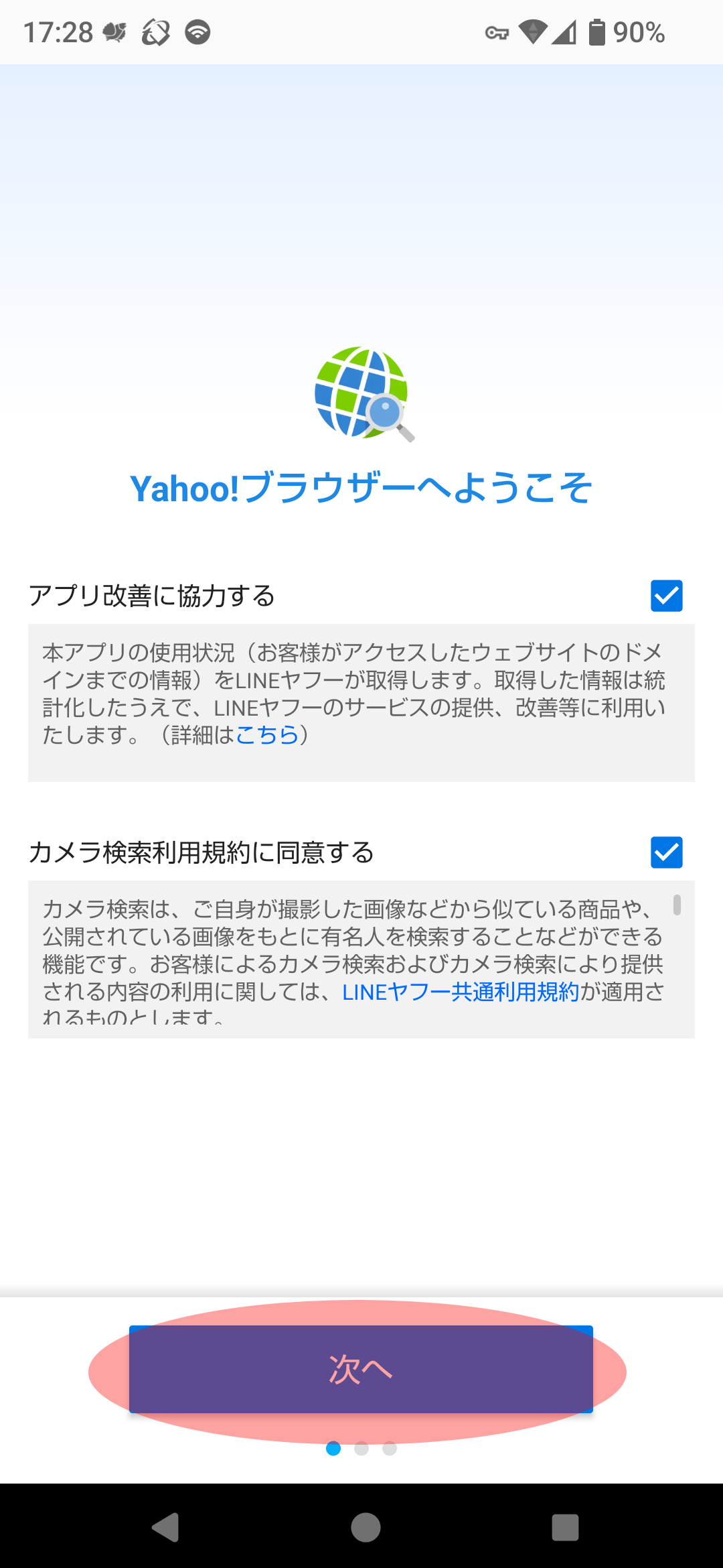| 6 | ![]() | Yahooブラウザーへようこその画面が出てくるので、下に有る次へを選択 |
