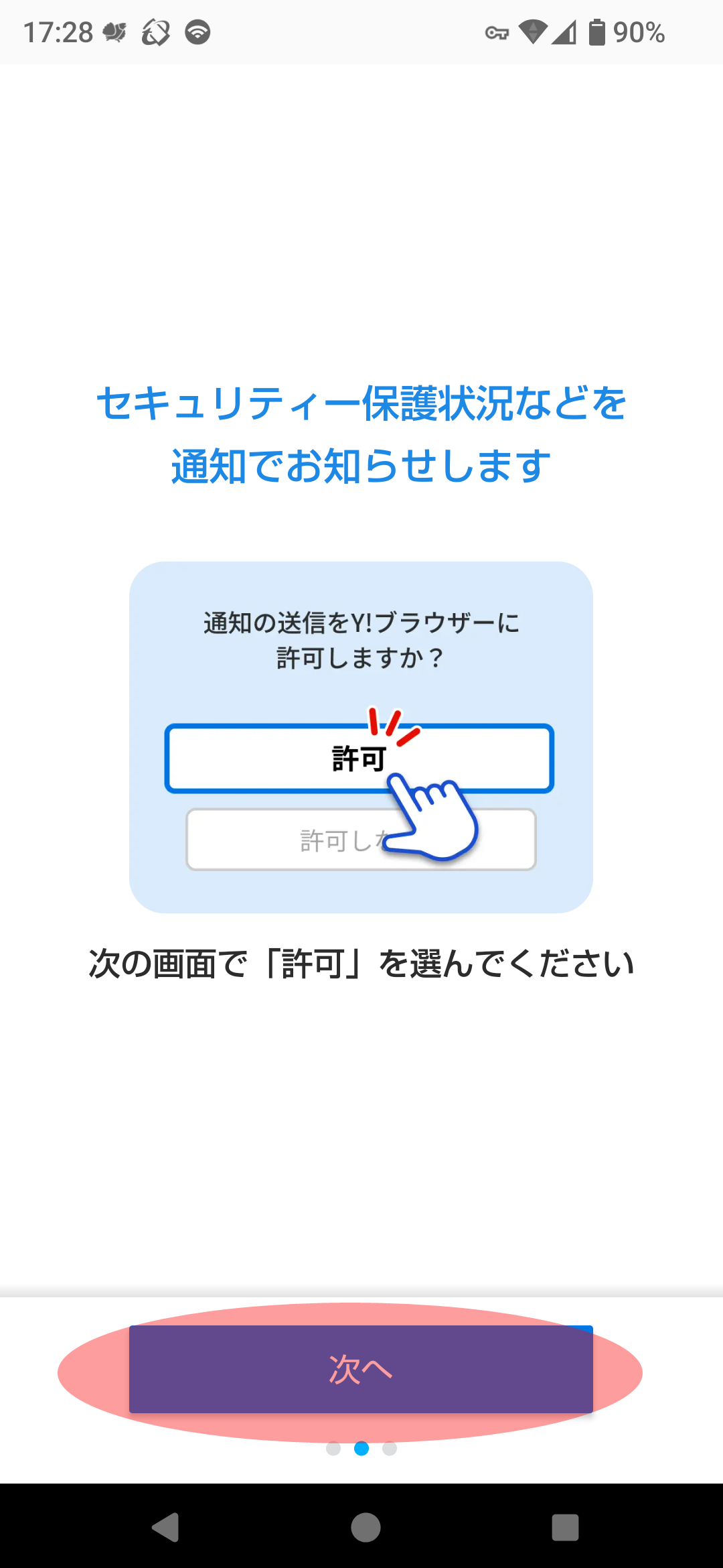 | 7 | ![]() | セキュリティ保護状況などを通知でおしらせしますの画面で出てくるので、次を選択 |