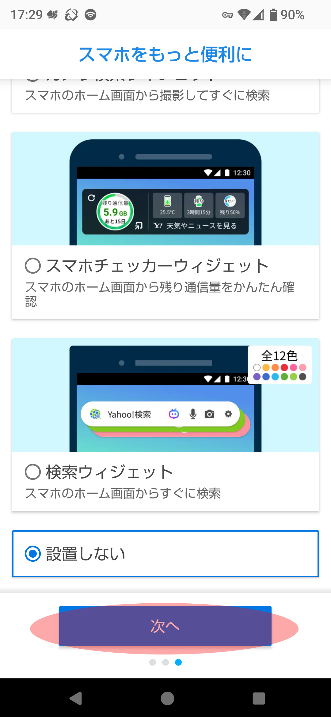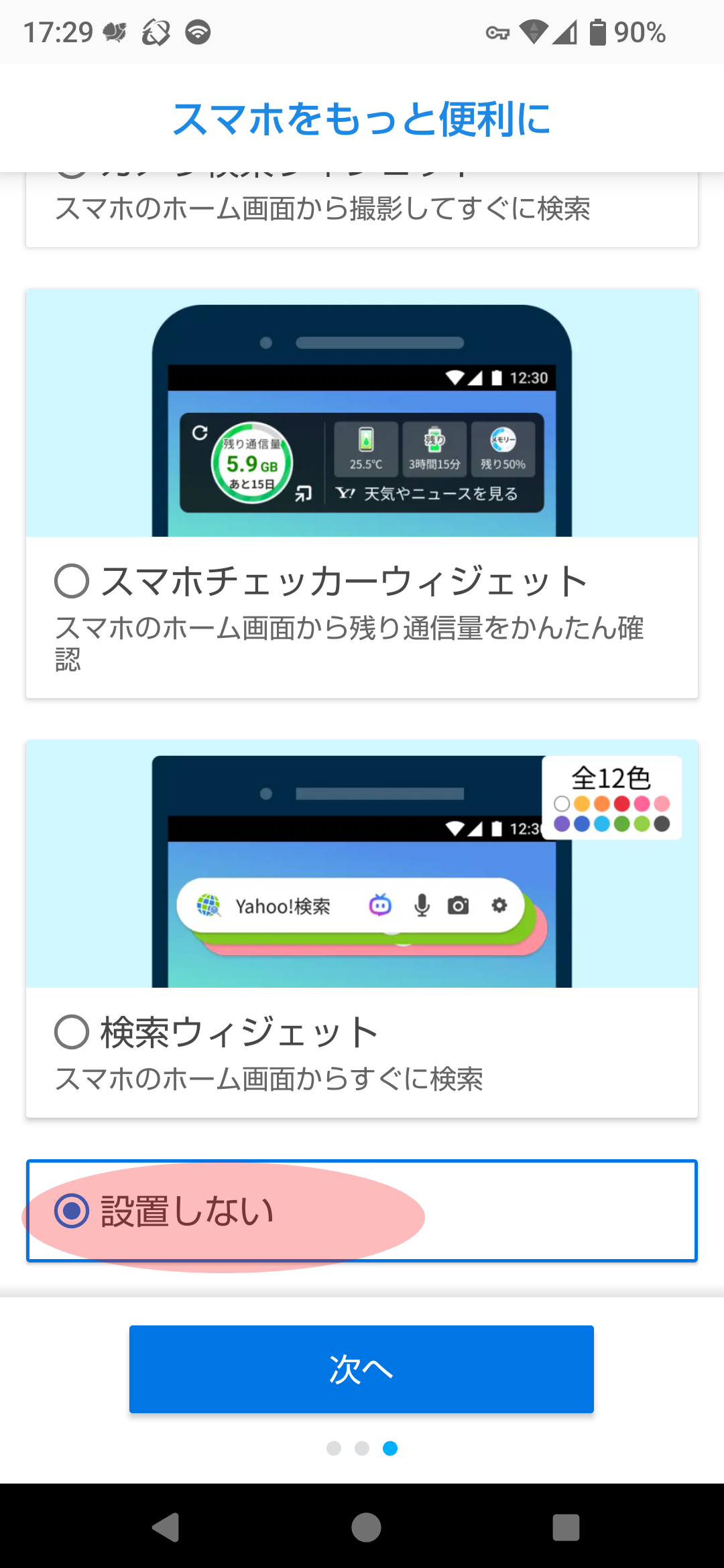 | 9 | ![]() | スマホをもっと便利にの画面の下の方に、設置しないの項目があるので、設置しないを選択 |