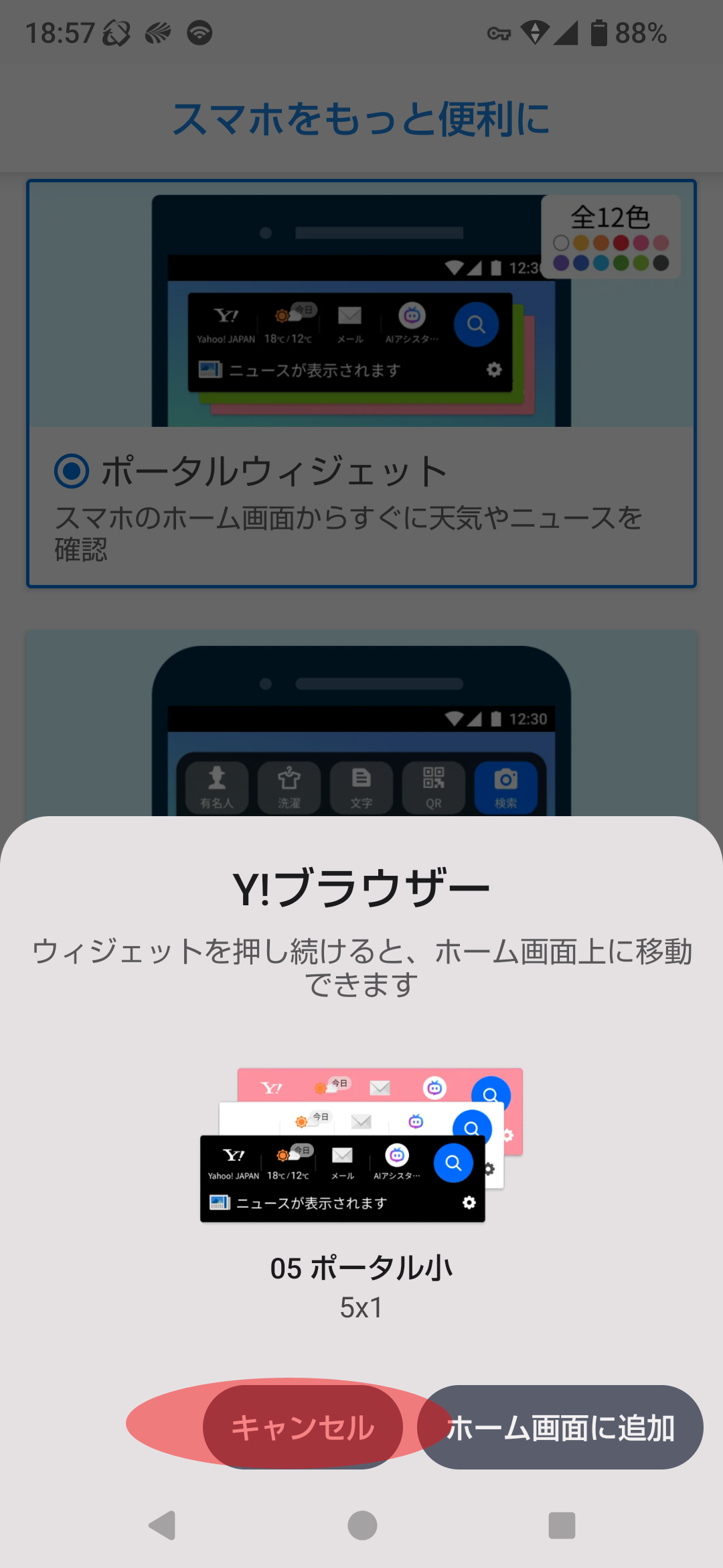 | 18 | ![]() | Y!ブラウザーという画面が下に出てくるので、ホーム画面に追加を選択 |