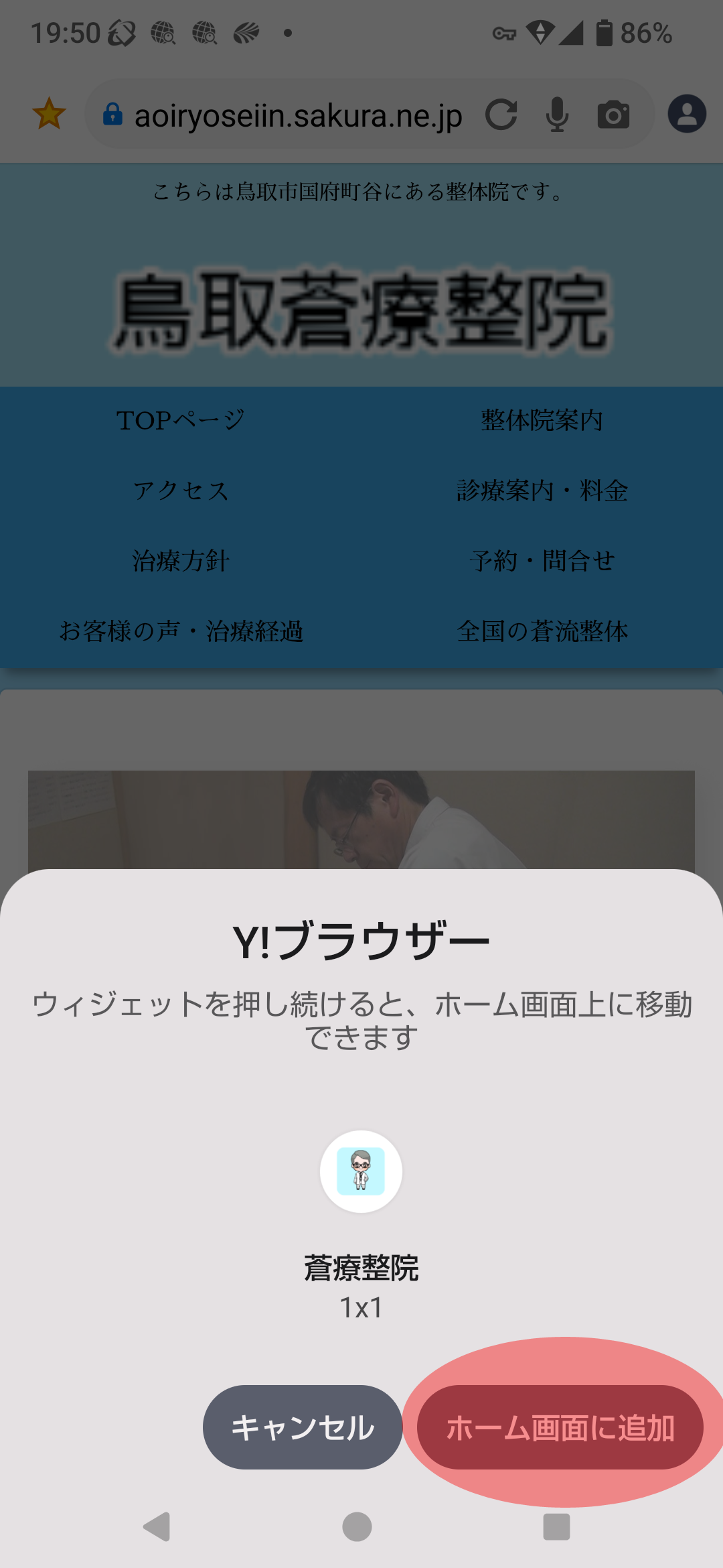 | 20 | ![]() | スマートフォンのホーム画面の空いているところに、蒼療整院のアイコンがでてくる。 これをクリックすれば、Yahooブラウザにて最新の予約状況を見ることが出来るようになります。 |
